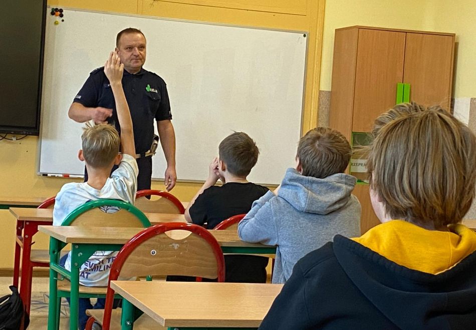 Spotkanie policjanta z uczniami dotyczyło konieczności przestrzegania przepisów ruchu drogowego, noszenia odblasków o zmroku, zapinania pasów w trakcie jazdy samochodem czy przechodzenia i przejeżdżania przez przejazd kolejowy. Uczniowie utrwalili również zasady zachowania się wobec obcych oraz wiele innych zdarzeń, w których trzeba zachować ostrożność. Głównym tematem jaki poruszał policjant to przechodzenie przez jezdnię, aby bezpiecznie dotrzeć do szkoły i do domu. Podczas rozmowy uczniowie mogli zadawać pytania, a mundurowy na każde z nich udzielał wyczerpującej odpowiedzi. Młodzi ludzie bardzo aktywnie włączyli się do tej dyskusji, dzięki czemu zostało wyjaśnionych wiele ciekawych zagadnień dotyczących bezpieczeństwa uczniów na drodze, w samochodzie, a nawet na podwórku.