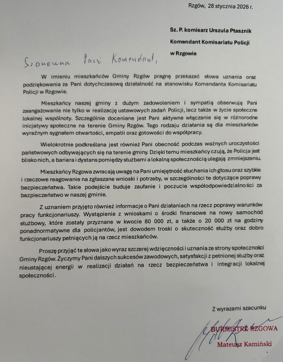 28 stycznia 2026 roku Komendant Komisariatu Policji w Rzgowie kom. Urszula Ptasznik otrzymała podziękowania od Burmistrza Rzgowa Pana Mateusza Kamińskiego. Podziękowania skierowane były dla rzgowskich policjantów, którzy każdego dnia dbają o bezpieczeństwo mieszkańców gminy. Podziękowanie złożyła również Zastępca Burmistrza Pani Monika Pawlik oraz przewodniczący Rady Miejskiej Jarosław Świerczyński.