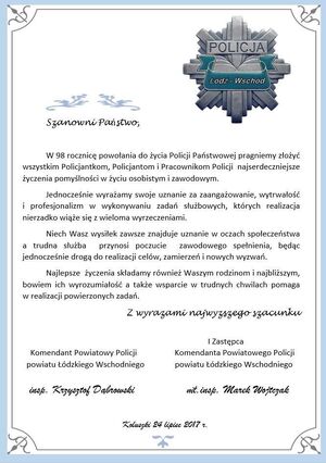 Z okazji Święta Policji, Komendant Powiatowy Policji powiatu Łódzkiego Wschodniego insp. Krzysztof Dąbrowski oraz I Zastępca Komendanta Powiatowego Policji powiatu Łódzkiego Wschodniego mł. insp. Marek Wojtczak składają życzenia wszystkim policjantkom, policjantom i pracownikom Policji.
