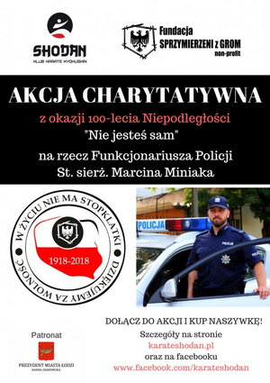 Klub "SHODAN ŁÓDŹ " wraz z fundacją non – profit "Sprzymierzeni z Grom", która pomaga funkcjonariuszom służb mundurowych w służbie czynnej i w stanie spoczynku oraz członkom ich najbliższych rodzin, zorganizowali wyjątkową akcję, by uczcić 100-lecie odzyskania niepodległości, a przy okazji pomóc policjantowi st.sierż. Marcinowi Miniakowi, który 15 grudnia 2017 ucierpiał podczas wybuchu w jednym z mieszkań przy ulicy Przemysłowej.w Łodzi.